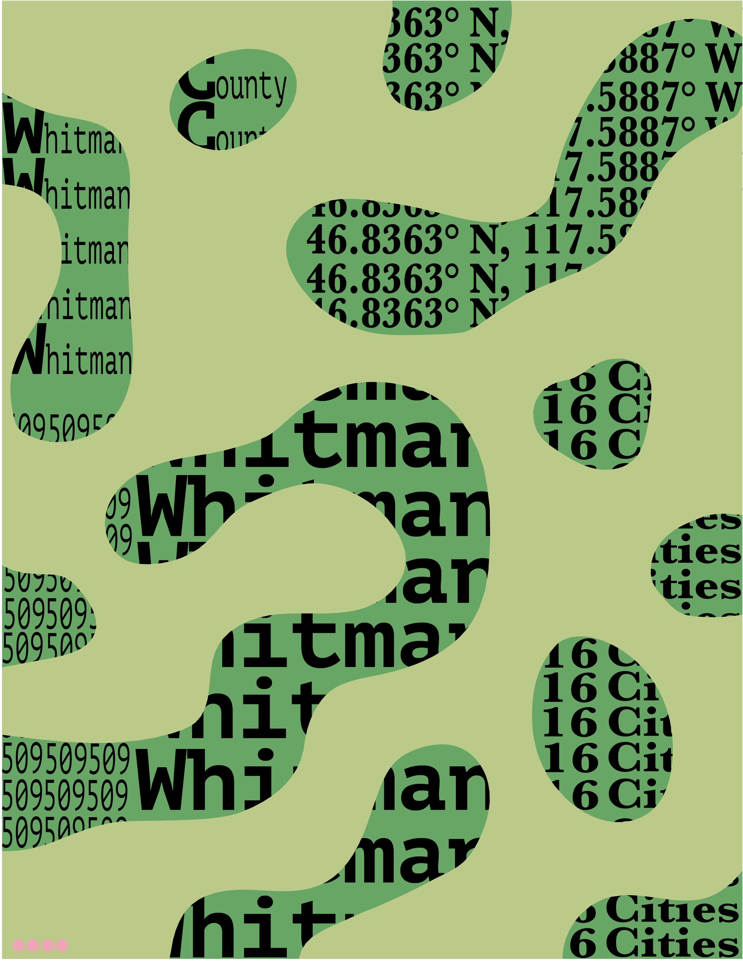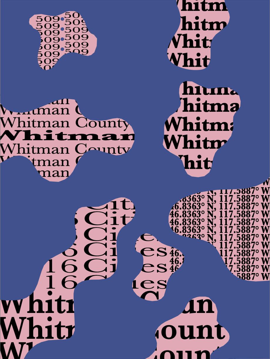 Whitman County is located in Southeastern Washington and contains sixteen cities. My group and I have been asked to create a design campaign highlighting the county. Over the last couple of months, my group has been creating fun and exciting graphics to put in our project. This portfolio will highlight my contributions to the campaign. My group chose to use four dots as a mark throughout our project. The mark changes size, color, and shape throughout the the designs.